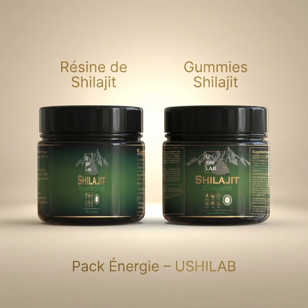 Le Pack Énergie USHILAB combine la puissance brute de la Résine de Shilajit, riche en acide fulvique et en plus de 80 minéraux essentiels, avec la formule gourmande et synergique des Gummies enrichies en Ginseng, Zinc et Vitamine B12.